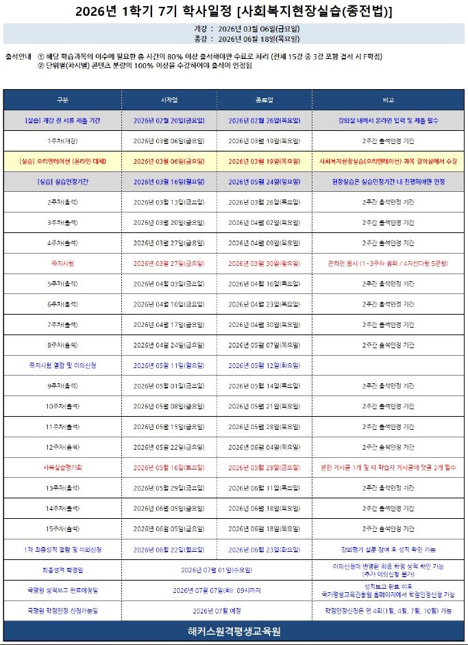 제목 2026년 1학기 7기 (3월 6일 개강반) 사복실습 (종전법_수도권) 운영지침