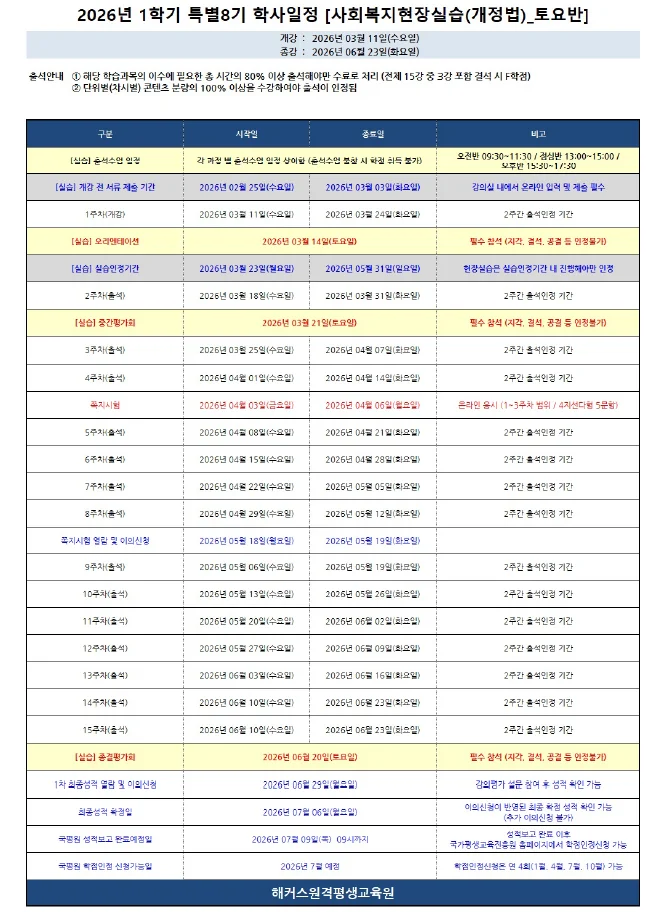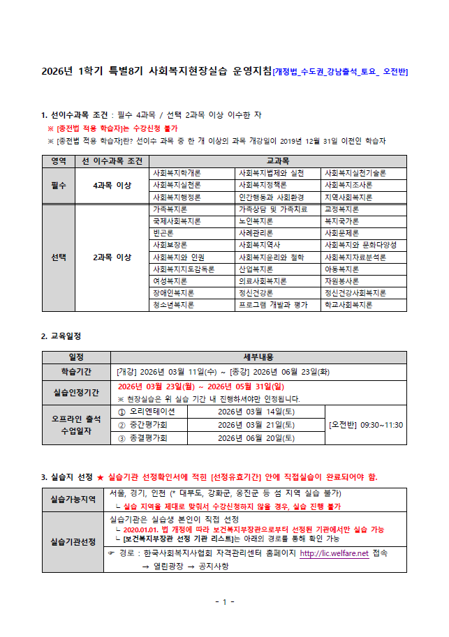 제목 2026년 1학기 특별8기 (3월 11일 개강반) 사복실습 (개정법_수도권_강남출석) 운영지침